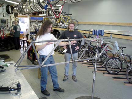 After the 3rd section is completed, Dan and David look the bike over to determine the best places for the braze-ons to go