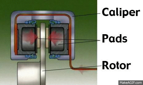 The brake caliper fits over the rotor like a clamp. Inside each caliper is
